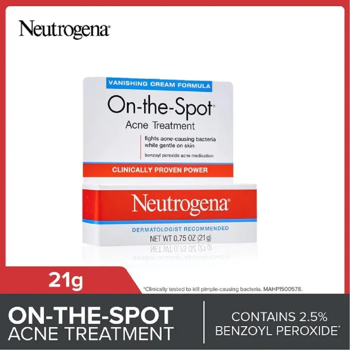 About this item .75-ounce tube of Neutrogena On-The-Spot Acne Spot Treatment cream with benzoyl peroxide to fight acne while gentle on skin ; Vanishing cream formula of this acne spot treatment is lightweight, absorbs quickly and works invisibly hour after hour to give long-lasting acne treatment Neutrogena On-The-Spot Acne Spot Treatment for Acne Prone Skin Care - 0.75 oz